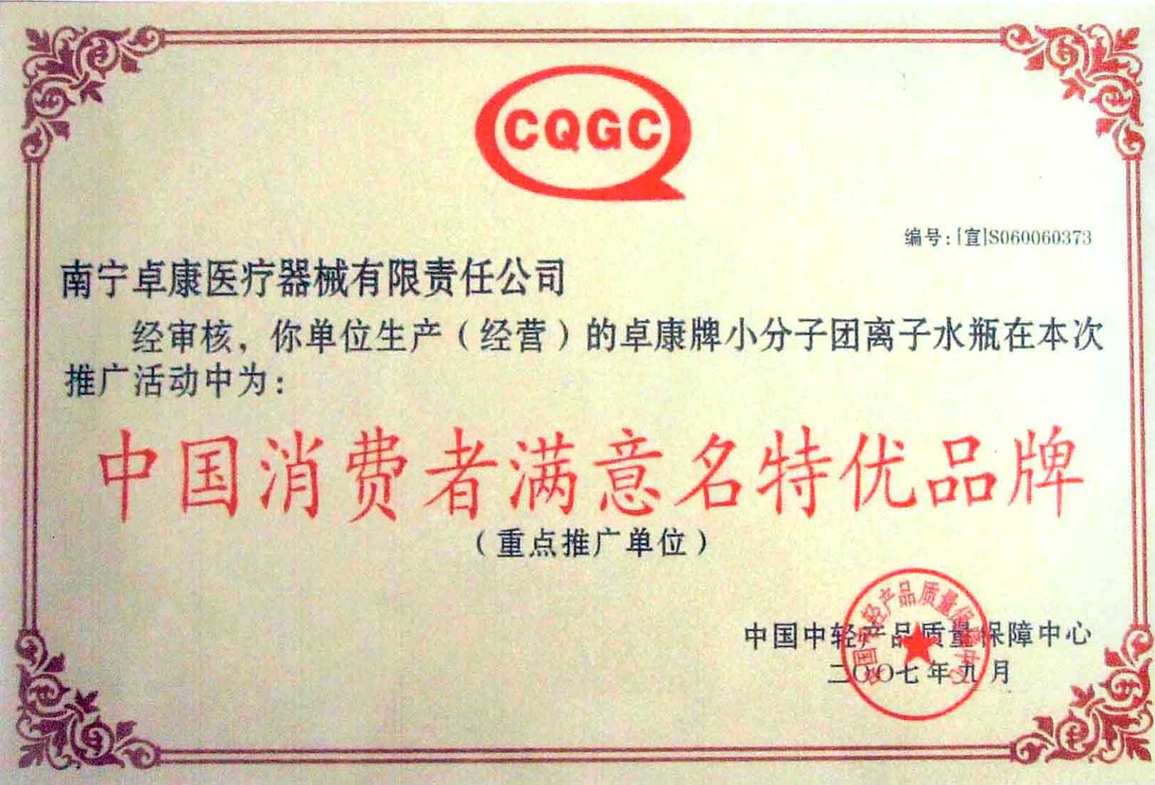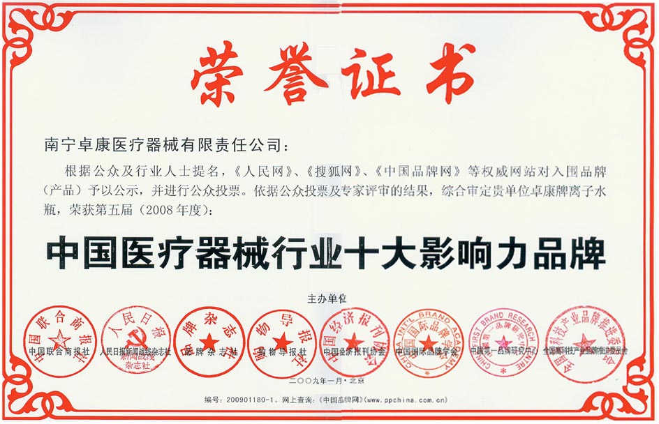 卓康牌離子水瓶榮獲中國名特優品牌[點小圖見大圖] *榮獲中國醫療器械行業十大影響力品牌[點小圖見大圖]--------