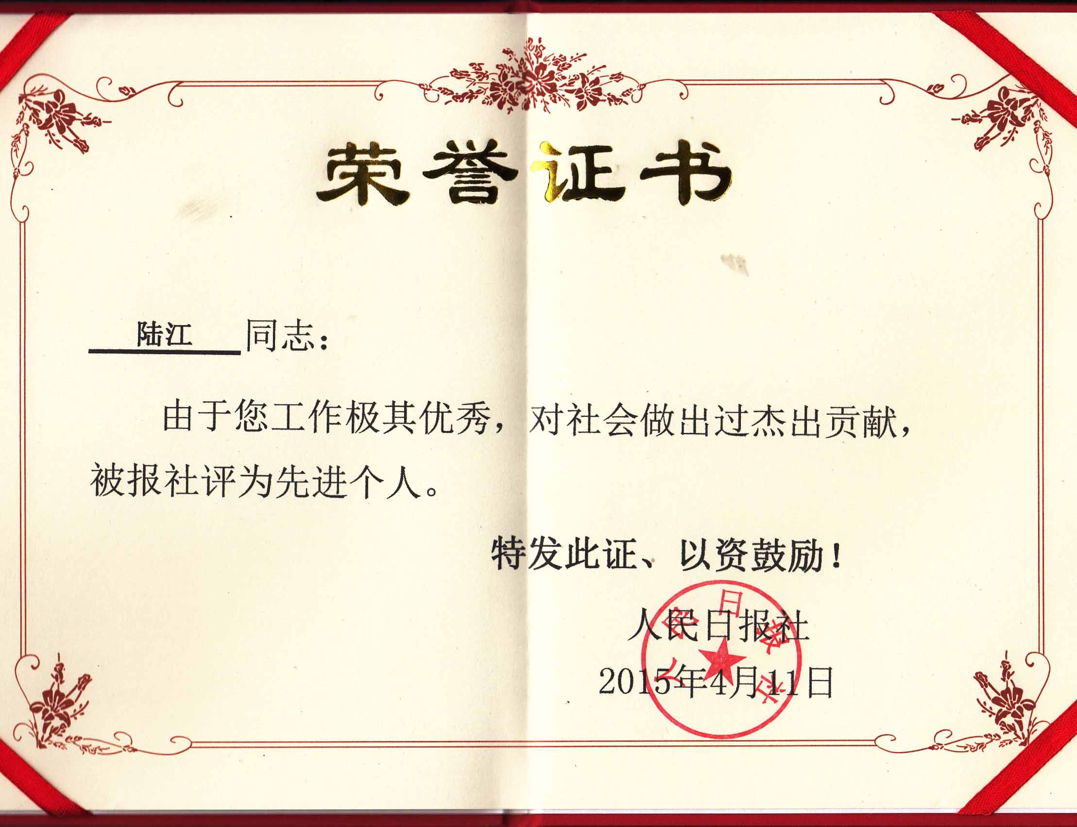 陸江的杰出貢獻被人民日報社評為先進個人