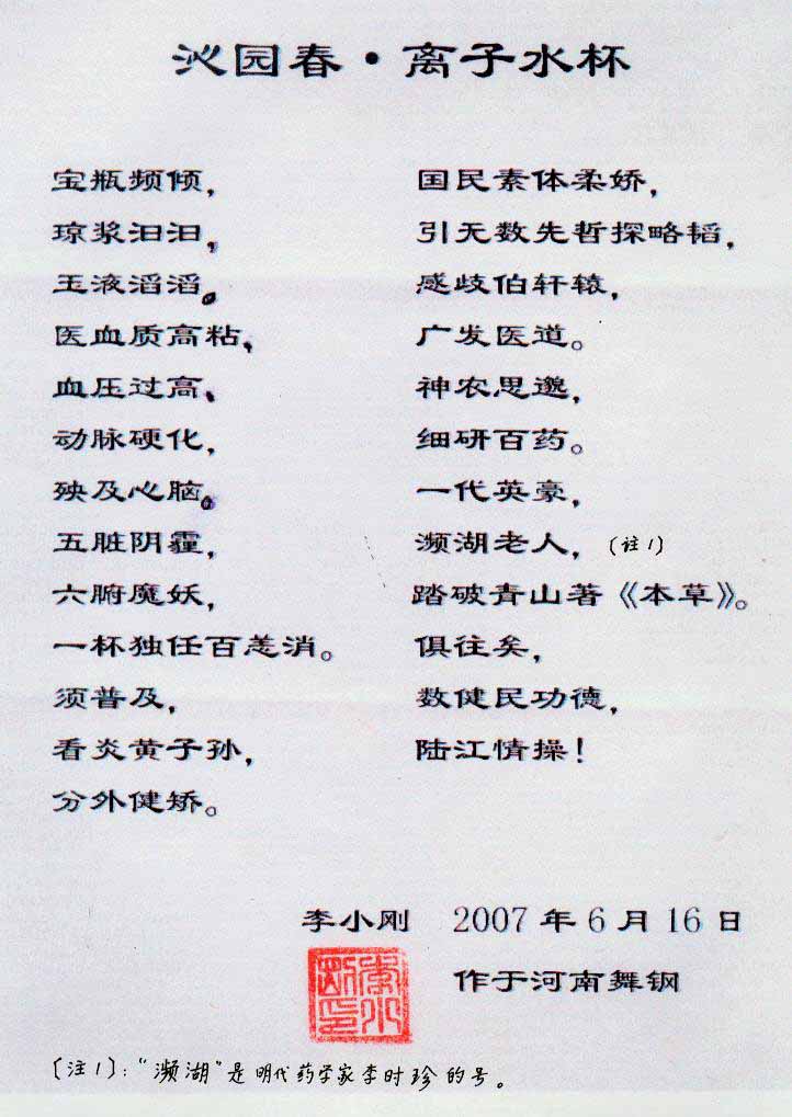 一.發明的亮點是中國基礎醫學研究成果的轉化醫學應用------------------------------------------------------------------------------------ 1990年春,我50歲,發現患了高血壓,便及時遵醫囑服藥。我想起父輩、祖輩曾患高血壓,后來都患中風癱瘓或心梗過世,所以心中壓力大。我夢想能根治高血壓,便研究醫學。當我檢索到中國基礎醫學研究成果,采用高脂餐和磁處理小分子團水飼喂小白鼠或大白免等兩組哺乳動物,經過2、4、6個月剖殺血檢,發現飼喂小分子團水的試驗組動脈內壁干凈,能減輕和延緩動脈粥樣硬化。我從這些研究成果受到啟發。覺得有責任研制出優良的器具,讓天下人能真正治愈高血壓,消除動脈粥樣硬化,延年益壽。于是,1990年我做成樣品,先后與愛人飲用兩三個月,分別治愈了高、低血壓,之后我們的血壓都正常,癥狀消失。該水經南京大學做核磁共振檢測為55.82赫茲的微小分子團水。該品經工業開發后,1994年送給廣西三家三甲醫院做臨床試用4個月,再經北京和廣西醫學專家鑒定認為:“降脂降壓效果好” ,“能擴大心腦動脈流量,改善心腦電圖和微循環” ,“對治療心腦動脈粥樣硬化、高血壓、高血脂有良好的醫療保健作用”。1996年產品獲得中國發明專利權。這就使產品可以轉化為醫學應用,人類可逐漸改變終生服藥,自己祛除病癥